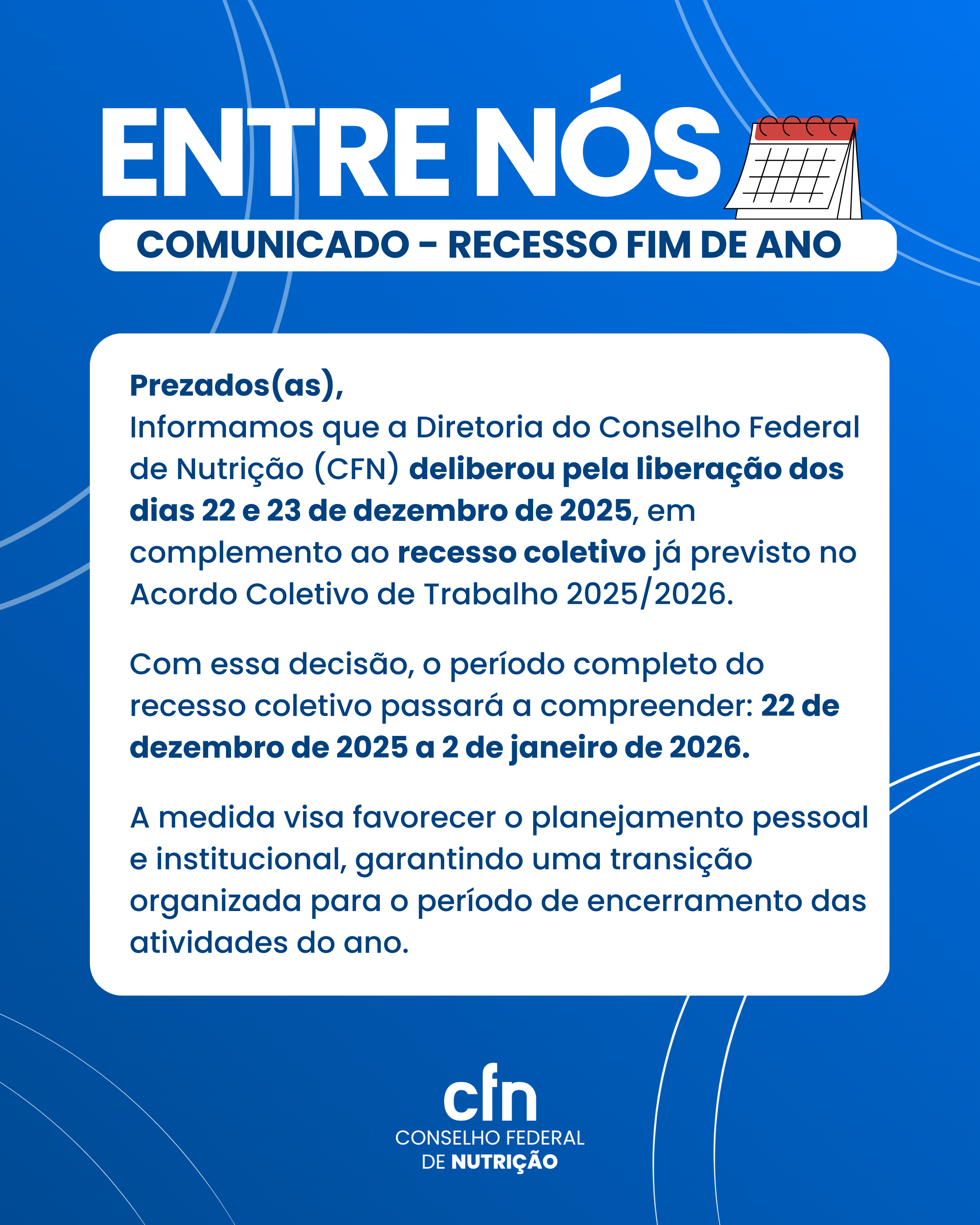2025-12-22 RECESSO FIM DE ANO! RECESSO FIM DE ANO! 22 de dezembro de 2025 - 2 de janeiro de 2026 RECESSO FIM DE ANO!